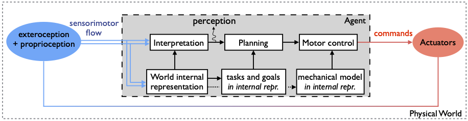 This very generic approach do work pretty well! As long as your models (of the robot, its sensors, the world, etc.) do fit pretty well the reality for the given task, quite amazing results can be obtained. But being able to deal with incomplete models (and they always are incomplete!), being able to face unpredictable situations where all your models can no longer apply is still a very difficult task. One solution could consist in questioning the aforementioned perception architecture. One could indeed envisage a new way to deal with perception where this ability is no longer somewhat given a priori by the designer of the system, but instead built and discovered by the robot, not from the raw sensory signals (i.e. the outputs od its sensors), but from the sensorimotor flow (i.e. the data made of the data coming from extero and/or proprioceptive sensors, and of the commands of the joints). Then, the previous architecture turns into